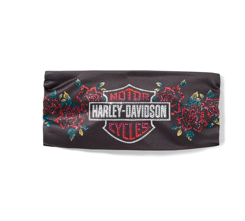 Lo stile motociclistico autentico pervade questa fascia Serpent Rose. Fabbricata in tessuto jersey misto poliestere/spandex, è perfetta per asciugare l'umidità ed è dotata di una fascia elastica che consente di indossarla senza problemi per ore e ore. Le rose impreziosite da strass si avvinghiano attorno allo stemma Bar & Shield, per un colpo d'occhio unico nel suo genere.