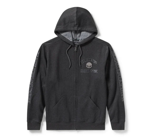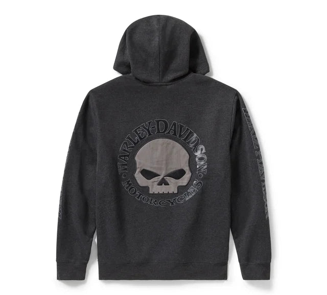 Indossa un capo che celebra il patrimonio creativo di Harley-Davidson. Realizzata per offrire un comfort accogliente, è fatta in tessuto pile misto cotone/poliestere ed è dotata di ampie tasche e di cappuccio foderato a contrasto con coulisse. Questo hoodie da uomo è rifinito con l'immagine del teschio di Willie G sul davanti e sul dorso, oltre che dal nome "Harley-Davidson" che corre lungo le maniche. Una pillola di storia: benché proprio il teschio sia una delle creazioni più famose di Willie G. Davidson, questo genio poliedrico firmò anche diverse motociclette, tra cui la FX Super Glide® del 1971 e la Low Rider® del 1977.